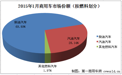 其中,按汽車燃料劃分,柴油汽車銷售196821輛,汽油汽車銷售79244輛,其他燃料汽車銷售5543輛,分別占1月商用車總銷量的69.89%、28.14%和1.97%。