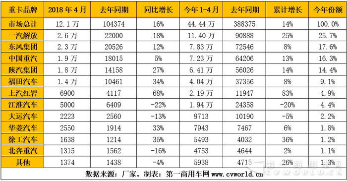 第一商用車網(wǎng)最新獲悉,2018年4月,我國重卡市場共約銷售各類車型12.1萬輛,比去年同期的10.44萬輛增長16%。今年1-4月,重卡市場累計銷售44.44萬輛,比去年同期的38.84萬輛上漲14%。