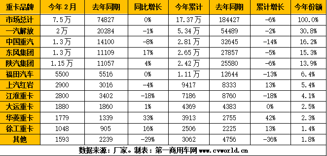 根據(jù)第一商用車網(wǎng)掌握的數(shù)據(jù),今年2月份,行業(yè)第一名依然是“老大哥”一汽解放,其當(dāng)月銷售重卡2萬輛,同比基本持平;1-2月,解放重卡累計(jì)銷售5.34萬輛,同比下滑2%,市場(chǎng)份額達(dá)到30.8%。