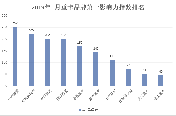 在2019年1月份(2018年12月31日-2019年2月3日)的五周內(nèi),國(guó)內(nèi)10家重卡企業(yè)(或品牌)的第一影響力指數(shù)總得分為1469分。就各家傳播表現(xiàn)來(lái)看,今年1月份,一汽解放的傳播力最強(qiáng),以252分摘得冠軍;東風(fēng)商用車以223分、中國(guó)重汽以202分,分別位居第二名和第三名。