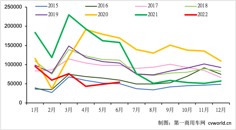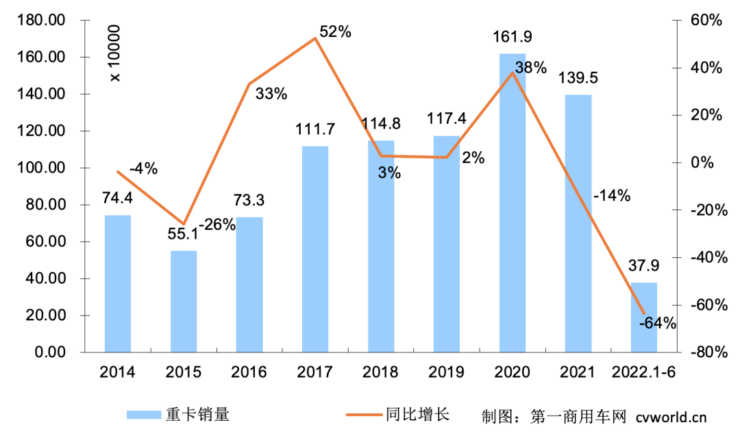 6月份過后,2022年上半年的重卡市場累計(jì)銷售37.9萬輛,比上年同期的104.5萬輛下降64%,減少了66.6萬輛。整個二季度,重卡市場累計(jì)銷售14.71萬輛,同比下降71%,凈減少36.6萬輛。