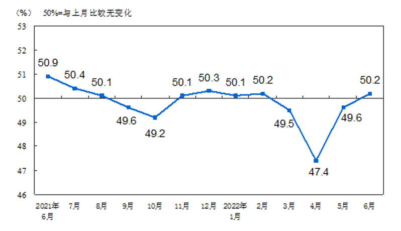 另據(jù)國家統(tǒng)計(jì)局最新發(fā)布的數(shù)據(jù),6月份制造業(yè)采購經(jīng)理指數(shù)為50.2%,環(huán)比回升0.6%,重回?cái)U(kuò)張區(qū)間。其中,建筑業(yè)商務(wù)活動指數(shù)為56.6%,高于上月4.4個百分點(diǎn),表明建筑業(yè)景氣度有所回升;同時,供應(yīng)商配送時間指數(shù)為50.5%,高于上月8.8個百分點(diǎn),升至擴(kuò)張區(qū)間,表明暢通交通物流政策取得實(shí)效,建筑業(yè)原材料運(yùn)輸不暢得到緩解,有力保障了施工進(jìn)度。