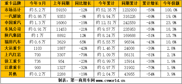9月重卡銷5.2萬輛環(huán)比漲13%!解放/重汽/東風/陜汽/福田銷多少?
