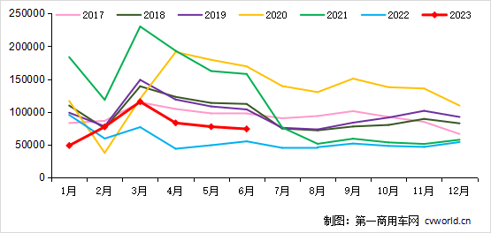 2017-2023年我國重卡市場銷量月度走勢圖(單位:輛)