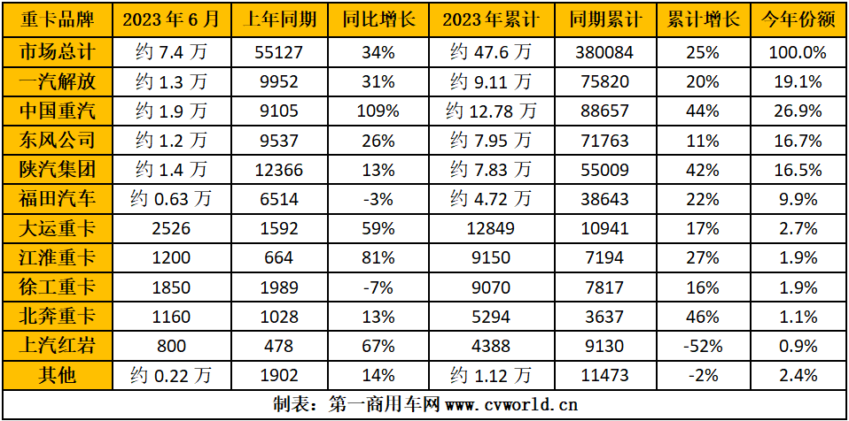 今年6月份,重卡市場以7.4萬輛“收官”,哪家企業(yè)的份額上升,哪家又下降了?